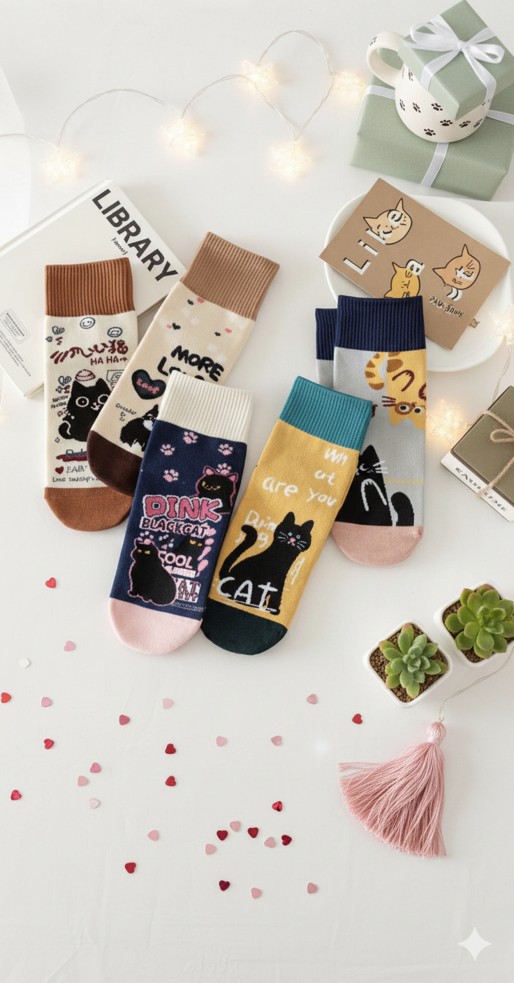 جوراب نیم ساق بچه گانه و زنانه ی نخی با طرح گربه درجه ی یک ست مادر و کودک