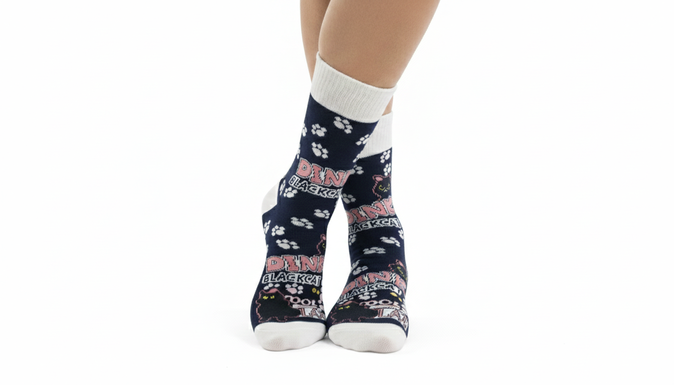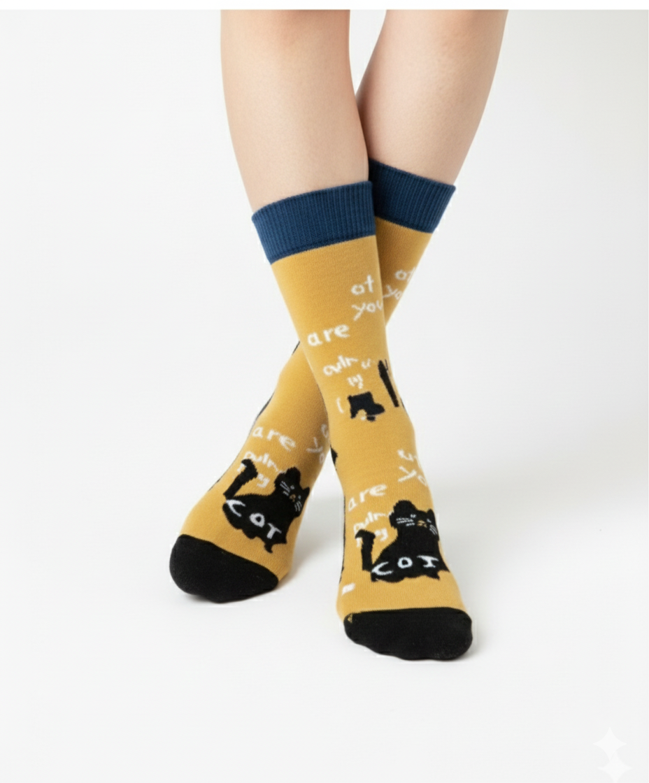 جوراب نیم ساق بچه گانه و زنانه ی نخی با طرح گربه ی سیاه درجه ی یک ست مادر و کودک