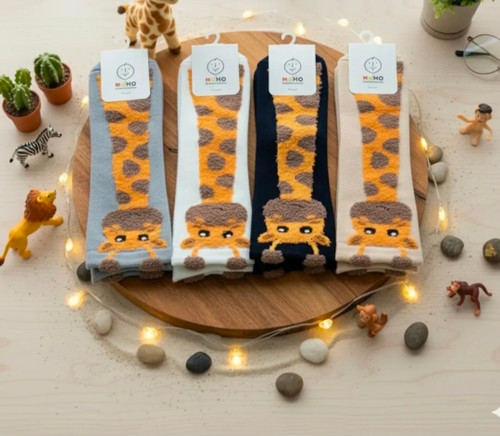 جوراب نخی بچه گانه ساق دار همراه با عروسک بوکله زرافه برجسته در چهار رنگ